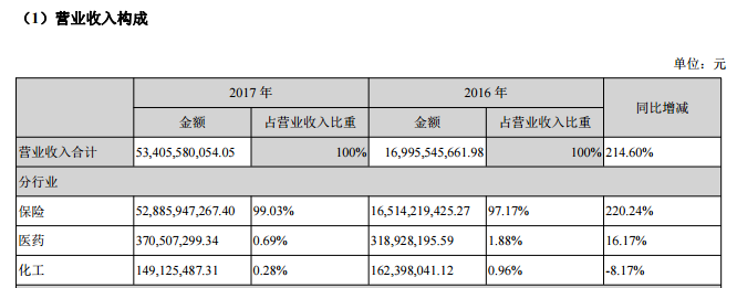 年报显示,天茂集团指出,报告期内,母公司作为投资控股型公司,通过控股子公司从事保险、医药、化工业务。据悉,天茂集团化工业务由全资子公司荆门天茂化工有限公司进行,主要生产、销售聚丙烯。但天茂集团也指出,“报告期受行业产能过剩的影响,化工行业整体开工不足”,截止2017年12月31日,天茂化工总资产2.98亿元,净资产1.49亿元,营业收入1.66亿元,净亏损0.62亿元。