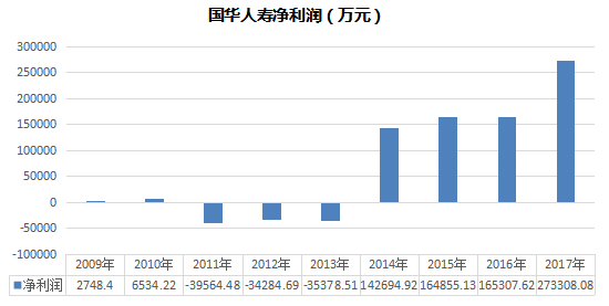 回顾来看,2009年至2010年,国华人寿均实现小幅盈利,后均陷入亏损状态,三年共计亏损10.92亿元。自从2014年净利润大幅上涨、实现扭亏为盈之后,国华人寿净利润或有长足提升,2017年实现净利润27.33亿元,同比涨幅达65.33%。