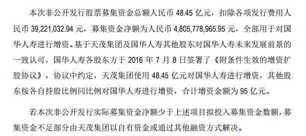 或是尝到盈利“甜头”,天茂集团一反此前,先是通过非公开发行方式募资98.5亿元,将其中“大头”用于收购国华人寿43.86%股权,将股比从7.14%提高到51%,控股国华人寿,后又再次主导非公开发行事项募资48.45亿元拟对国华人寿进行增资。