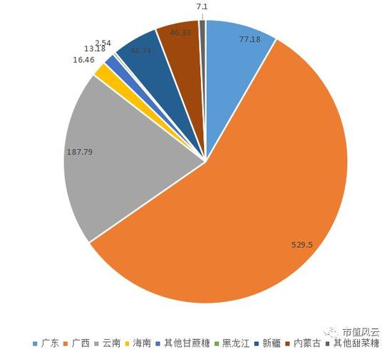南宁糖业地处广西,是我国甘蔗糖的主产区之一。下图是16/17榨季中国各省产糖量分布。