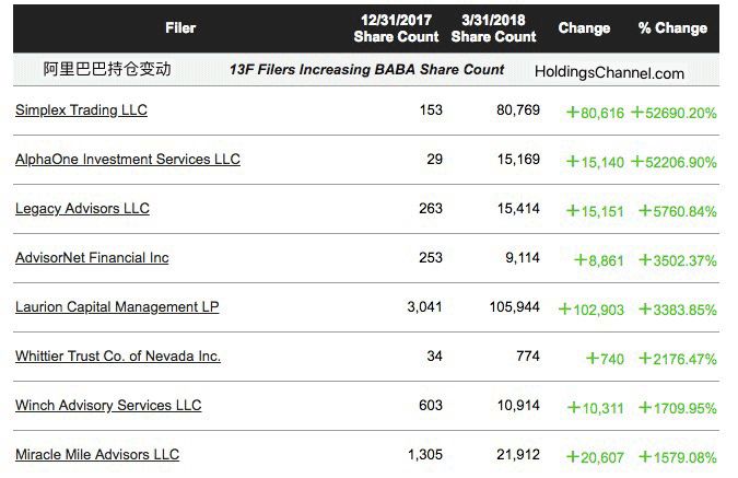 此外,阿里巴巴还获挪威央行建仓375.66万股,Viking Global Investors建仓220.2万股。