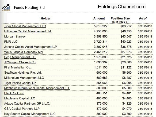 哔哩哔哩(14.11,0.00,0.00%): 这家一季度刚刚赴美上市的中国视频弹幕网站公司,投资名单上有着数家明星机构,包括老虎全球管理、摩根士丹利、摩根大通、Point72资产管理等。