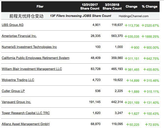 前程无忧(104.75,3.36,3.31%):增持方包括Vanguard集团、花旗集团、安联资产管理等。