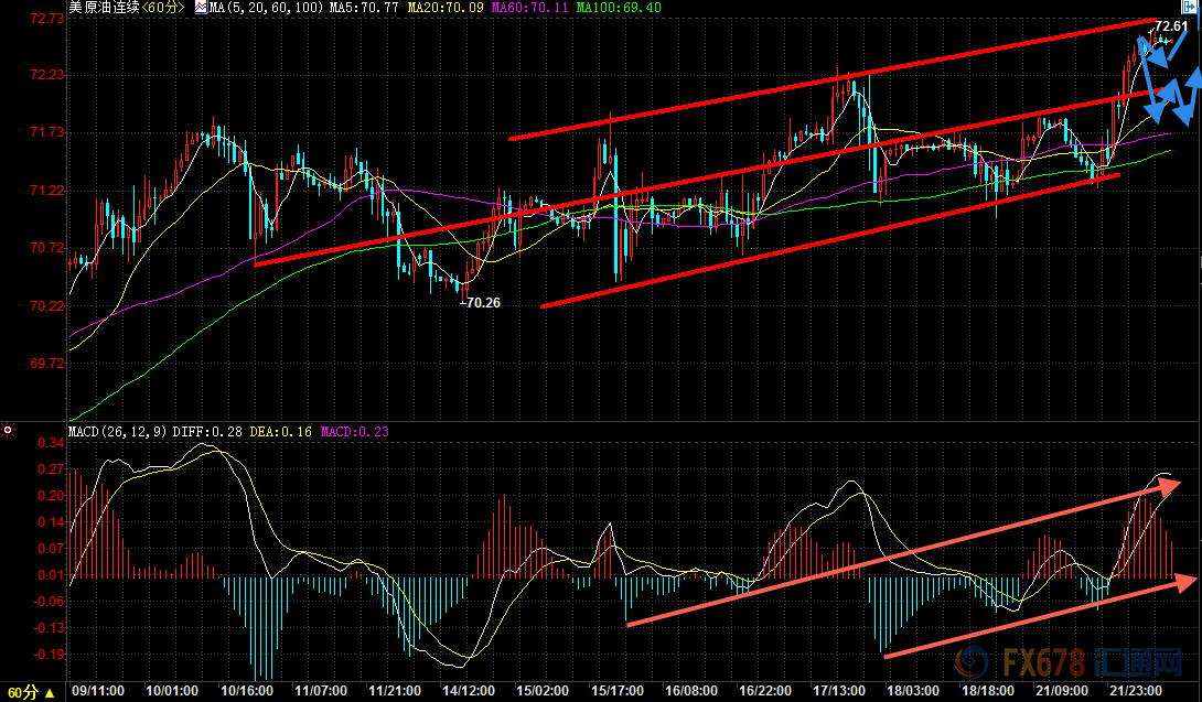 1小时图上,美油迅速突破了71.94美元后出现了加速上行的走势,并试探了上升通道的上沿。短时间而言,MACD继续收出红柱的可能性很大,因此短时间依然维持看涨的观点。