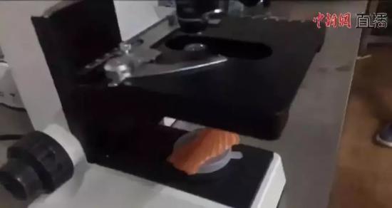 检验人员切了一片生鱼片,放在了显微镜下观察。