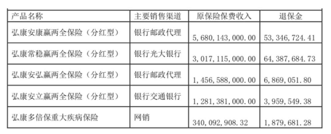 2019年,分红险是我国寿险市场上保费收入最高的产品,而分红险中销量最大的则是分红型两全保险。而弘康人寿一直以来都以分红险业务为主打。据年报显示,2019年,弘康人寿前五大保险产品中4款为分红型两全保险,合计实现原保费收入114.35亿元,占公司原保费收入的90.17%。