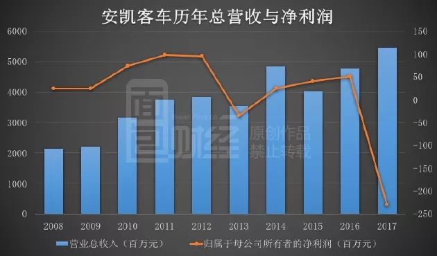 安凯客车近日发布财报:2017年总营收为54.49亿,同比上涨14.54%;亏损2.3亿,上年同期为盈利5135万。