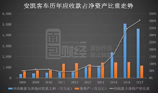 截至2017年底,公司应收款(应收账款与其他应收款之和)为45.99亿,同期,公司净资产仅为11.4亿,应收款是公司净资产的4.03倍。