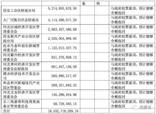 固安工业区财政分局应收账款52.14亿元,固安新兴产业示范区财政分局应收25.20亿元,两者共计77.34亿元,但是,2017年固安财政收入只有98 亿元,回收风险还是很大的;大厂县财政局应收41.14亿元,2017年,大厂现财政收入仅只有54.1亿元,回收风险非常大;怀来县沙城应收26.63亿元,2017年,怀来县财政收入27.9亿元,回收风险相当大!