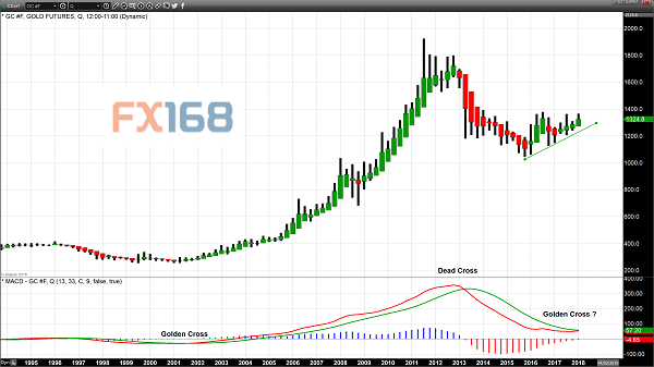 Wagner根据MACD指标进行分析,该指标显示,自2013年1月以来,移动平均线首次出现收敛,更短期移动平均线即将突破长期移动均线,这将创造出2001年10月以来的首个金叉。2001年也出现过金叉,当时金价交投在300美元/盎司下方。令人印象深刻的是,这标志着黄金开始持续多年反弹的时间点,直指2011年年中,当时黄金交易价格超过1900美元。
