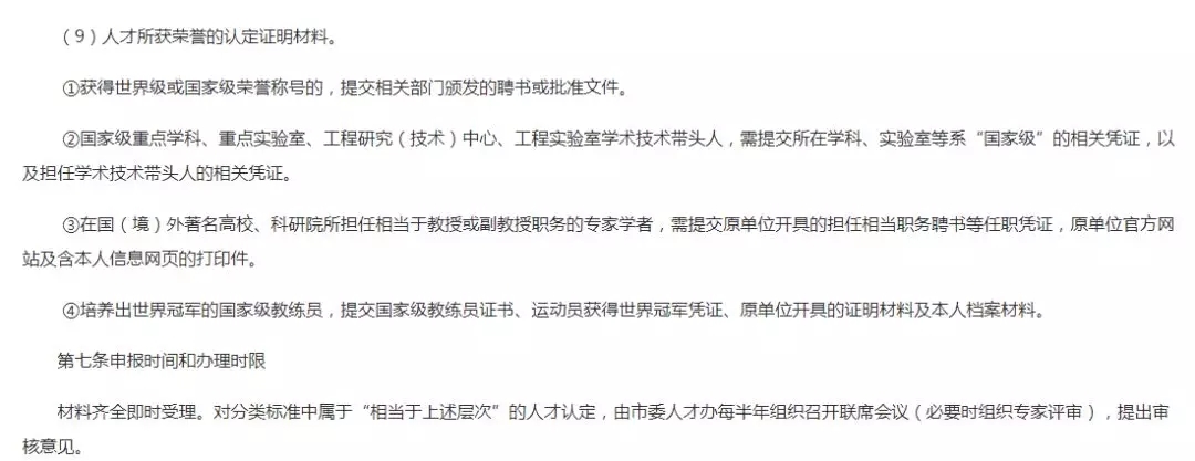 其中对申请“高层次人才”认定做了详细规定,九项所需材料当中,除了申请表、社保缴纳证明、学历学位证书等,还需要提供人才所获荣誉的认定证明材料。