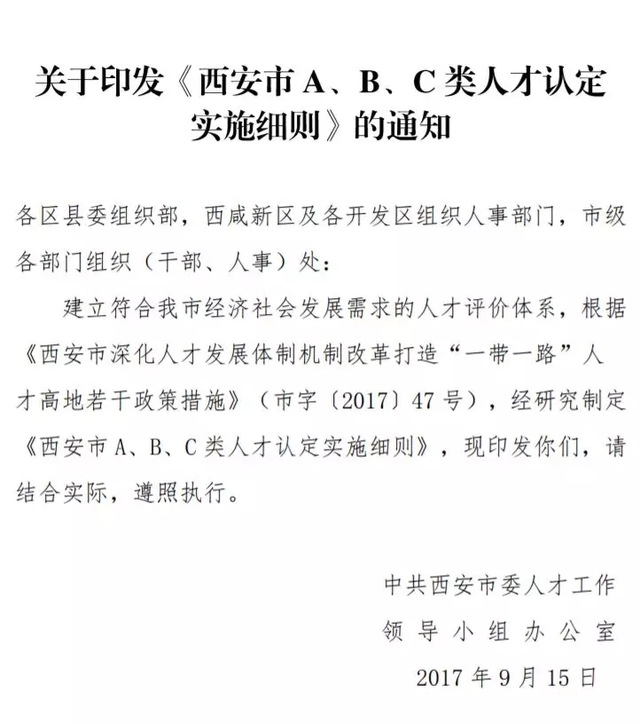 小编又仔细查阅了中共西安市委人才工作领导小组办公室在2017年下发的《西安市A、B、C类人才认定实施细则》。