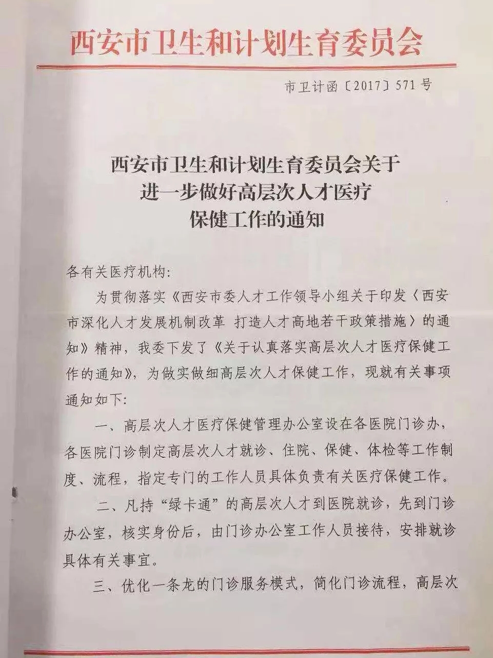 小编认真搜索了一遍,西安市在2017年就下发了《西安市卫生和计划生用户委员会关于进一步做好高层次人才医疗保健工作的通知》,这其中就规定,高层次人才有绿卡通,可以看病优先,挂号免费。