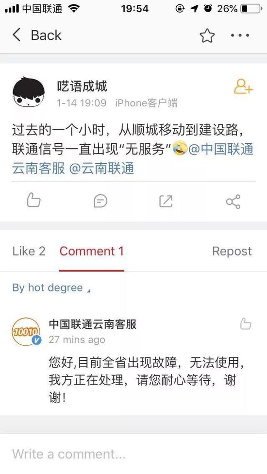 云南联通昨晚全省没信号没网络 有人称习以为常