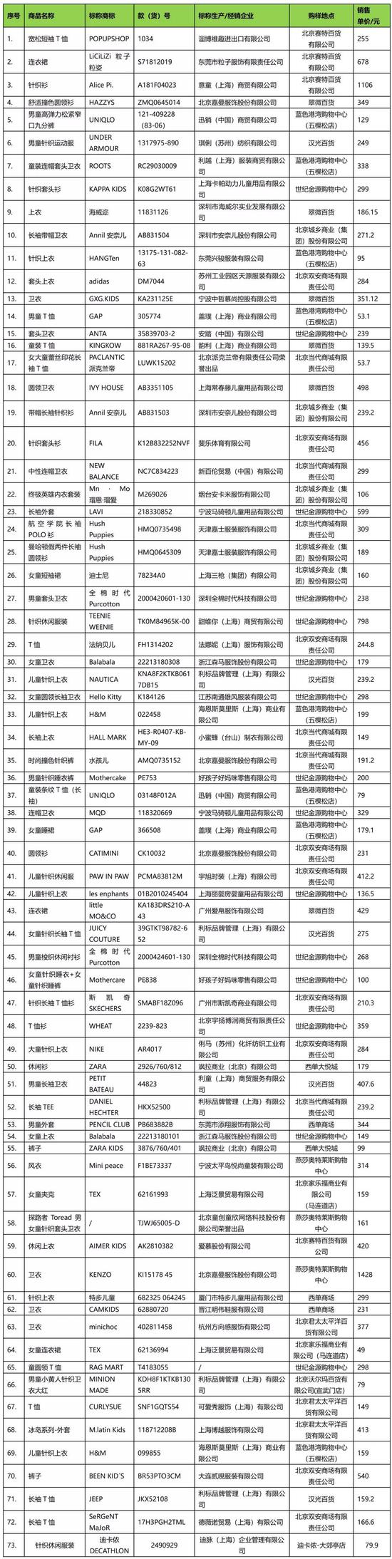 本次比较试验的样品是由北京市消协的工作人员以普通消费者的身份从实体店铺随机购买了80款儿童服装商品,68个品牌。购买价格从49元至1428元不等。