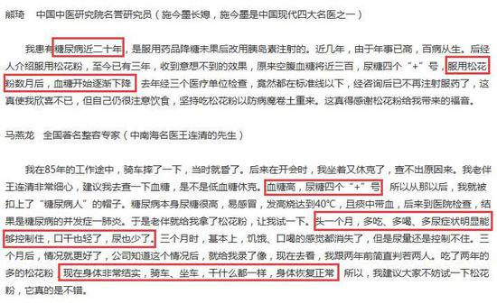 在一本新时代国珍的宣传画册中,一行“松花粉具有抵抗艾滋病功效”的标题分外吸人眼球;在一些代理列举的“吃国珍松花粉效果实例”中,新时代国珍似乎还治好了糖尿病。
