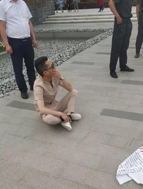 宋某某被打一耳光后坐在地上,而潘某某车顶上的维权广告也被扯了下来。