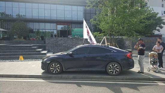 原来,潘先生定制了一面白色旗帜和一块白色广告牌,旗帜上写着“严惩涉黑雅居乐”,广告牌上写上“天理何在:武汉雅居乐花园,勾结黑社会殴打业主,致使三根肋骨骨折,至今没受任何惩罚。”他把旗帜和广告牌放到私家车顶上,然后一个人就开出去,在5月3日下午开到了雅居乐花园的售楼处门外。