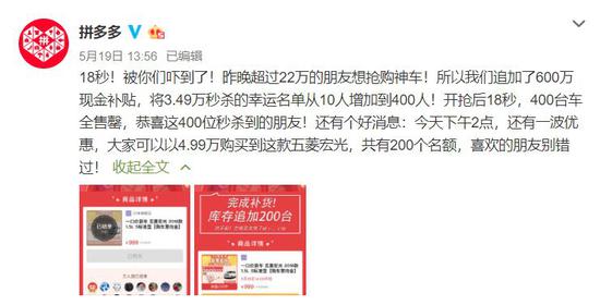 5月19日下午,拼多多官方微博发文称,由于超过22万人想抢购“神车”,拼多多决定追加600万元现金补贴,将3.49万元秒杀的名额从10人增加至400人。开抢后18秒,400台五菱宏光全部售罄。有网友对此评论称,“18秒,我还没准备好姿势就已经抢完了。”