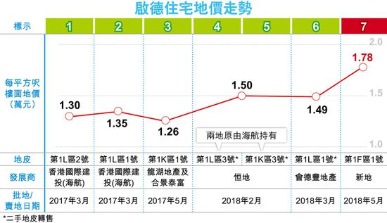 近期启德区内地价持续攀升,以是次地王为例,可建楼面面积141.5万平方呎,即每平方呎楼面地价约1.78万元,相较2017年5月龙湖地产(25.25,0.15,0.60%)(00960)等投得的第1K区1号(1.26万元呎),一年时间地价升逾4成,亦较今年3月份会德丰(59.35,0.30,0.51%)地产向海航集团购入的第1L区1号地皮(1.49万元呎)高出近2成。