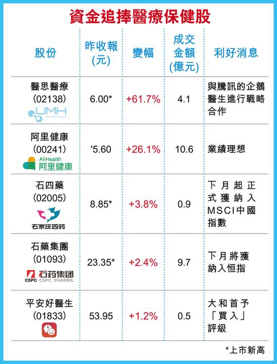 腾讯(00700)及阿里体系的医疗保健企业昨发力上冲,约15亿元资金追捧,医思(02138)及阿里健康(5.78,0.18,3.21%)(00241)分别是升幅榜首(升61.7%)及第四位(26 %),连带其他医疗保健股亦上扬。