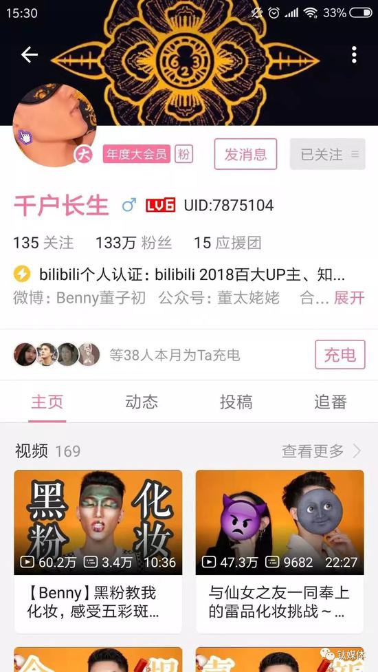 千户长生更广为人知的ID,是@Benny董子初。这个96年的男孩,2016年开始在B站更新美妆视频。男性、彩妆、毒舌的标签,让他成为B站最早走红的时尚博主之一。不到一年,积累粉丝70万。这时候,一位美妆品牌创业者,找上了他。