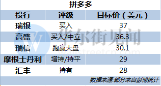 目前华尔街大行看好拼多多,大部分给出买入评级。彭博统计,目前包括高盛(197.25,0.62,0.32%)、瑞信、摩根士丹利(42.41,0.38,0.90%)在内的投行等给出了买入/跑赢大盘的评级;汇丰1家给出了持有评级。目标价方面,高盛给出了36.3美元,瑞信30.1美元,摩根士丹利为29美元,汇丰相对较低,给出的目标价为28美元。