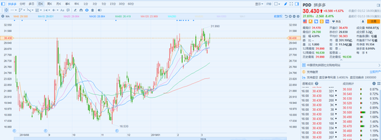 拼多多股价自去年11月跌入上市以来低位后持续震荡攀升,目前30美元一线依旧对其股价上涨形成压力。