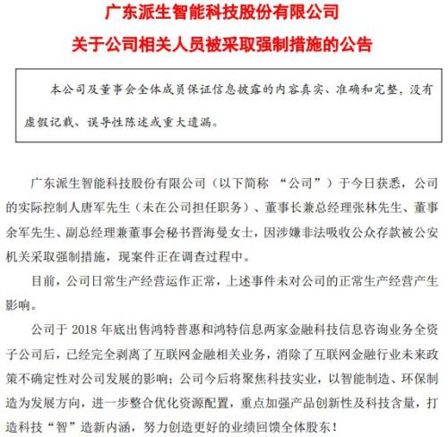 1. 派生科技实控人唐军、董事长兼总经理张林、董事余军、副总经理兼董秘晋海曼女士,因涉嫌非法吸收公众存款被公安机关采取强制措施。