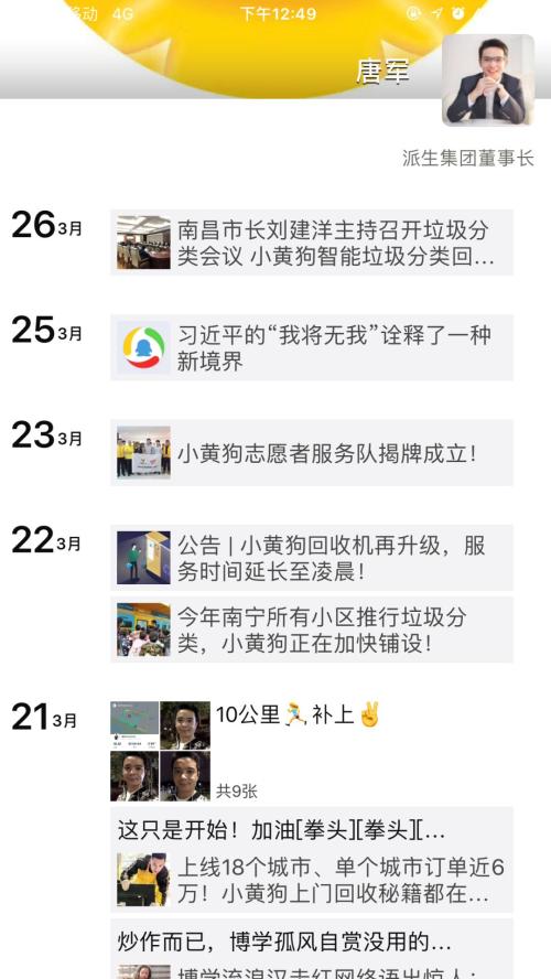 唐军的朋友圈内容显示,就在26日,唐军还转发了一条“南昌市长刘建洋主持召开垃圾分类会议 小黄狗智能垃圾分类回收获认可”的朋友圈。但次日就去公安机关投案,也是相当魔幻了。