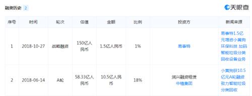 据天眼查数据显示,2018年6月,小黄狗完成A轮融资10.5亿元人民币,由中植集团投资,创下国内再生资源回收行业单笔最高融资纪录,合景泰富集团随后入股。10月,小黄狗获得A股上市公司易事特(5.710,-0.15,-2.56%)1.5亿元增资,12月,小黄狗再与新华联(4.580,-0.13,-2.76%)集团达成1.5亿元投资协议,目前估值150亿元。