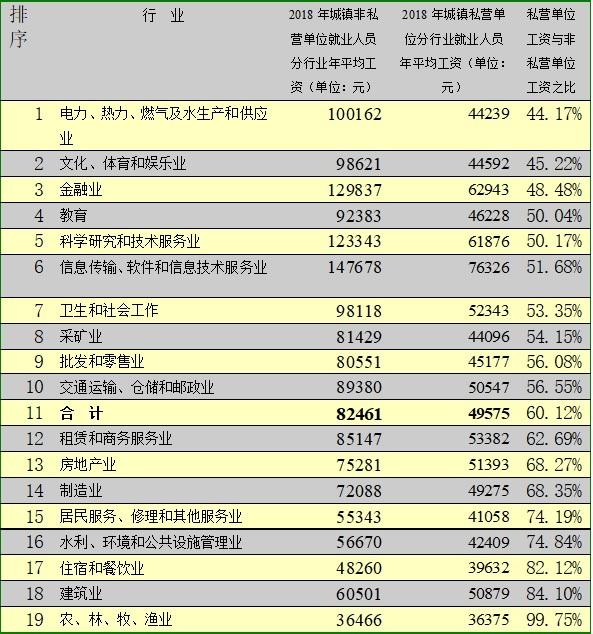 比如在信息传输、软件和信息技术服务业,金融业,科学研究和技术服务业,文化、体育和娱乐业,卫生和社会,电力、热力、燃气及水生产和供应业,教育,文化、体育和娱乐业,私营单位的年平均工资,只有非私营单位的一半左右。