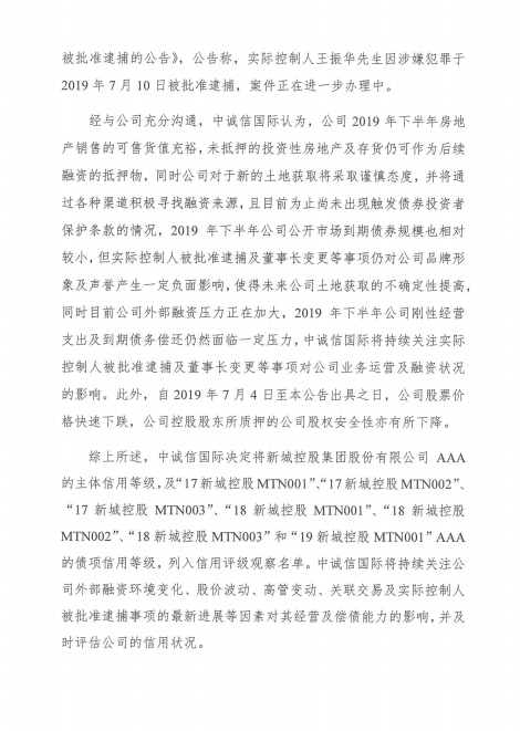 7月11日,中诚信国际今日在上清所公告称,将新城控股(27.090,-0.97,-3.46%)集团股份有限公司主体及相关债项的AAA评级列入信用评级观察名单。公告称,公司目前为止尚未出现触发债券投资者保护条款的情况,下半年公司公开市场到期债券规模相对较小,但实际控制人被批准逮捕及董事长变更等事项,对公司品牌形象及声誉产生一定负面影响,使得未来公司土地获取的不确定性提高。此外,自2019年7月4日至本公告出具之日,公司股票价格快速下跌,公司控股股东所质押的公司股权安全性有所下降。