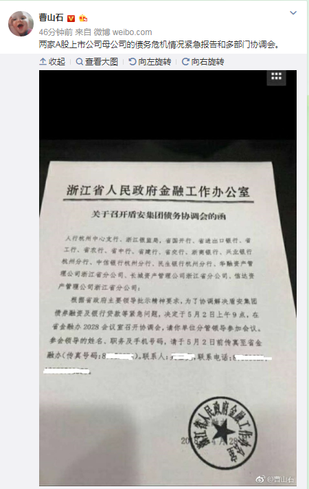 5月3日消息 知名财经博主曹山石于微博爆料拥有盾安环境和江南化工两家上市公司的盾安集团出现债务危机。