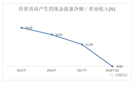 济民制药的经营活动产生的现金流量净额/营业收入(%)这个指标也是近3年来大幅跳水,2018年第一季度已经是负数,说明营业收入创造出的现金流量净额质量越来越差,甚至有净流出的迹象。