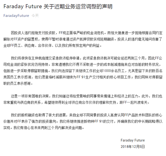FF公司将进一步采取停薪留职措施 应对现金流危机
