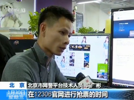 北京市网警平台技术人员 冯广彬:如果说我们普通用户或者网民在12306官网进行抢票的时候,我们频率也就几秒,但是这些抢票软件已经达到毫秒级别的速度,在100毫秒之内提交一次抢票,这是黄牛或者网民选择使用这些抢票软件的原因。