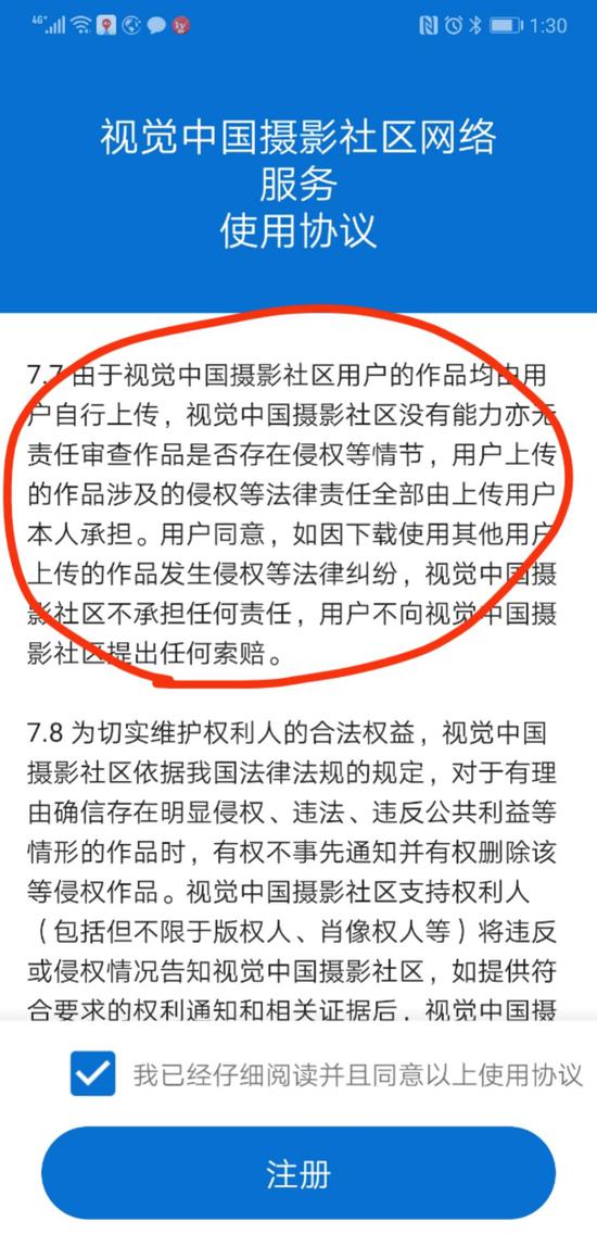 《商学院》记者尝试在视觉中国摄影社区500PX中国版上注册,在使用协议中可以看到,其称“视觉中国摄影社区用户的作品均由用户自行上传,视觉中国摄影社区没有能力亦无责任审查作品是否存在侵权等情节,用户上传的作品涉及的侵权等法律责任全部由上传用户本人承担。