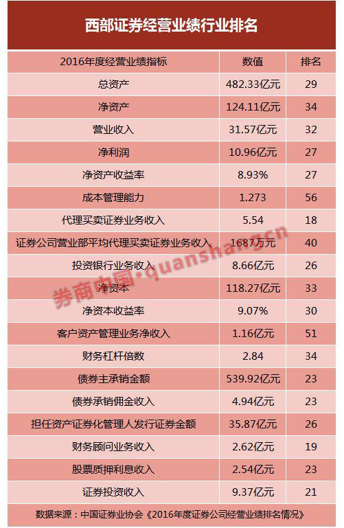 中国证券业协会已公布的统一口径下的数据显示,早在2005年,西部证券有三项经营业绩数据进入了全行业前20名。截至2006年末,西部证券总资产49.8亿元,营业收入11.24亿元,净利润5.9亿元。