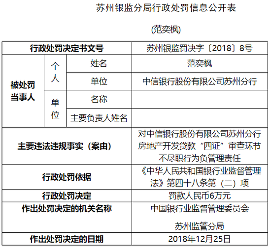中信银行苏州分行被罚80万:贷款四证审查环节不尽职