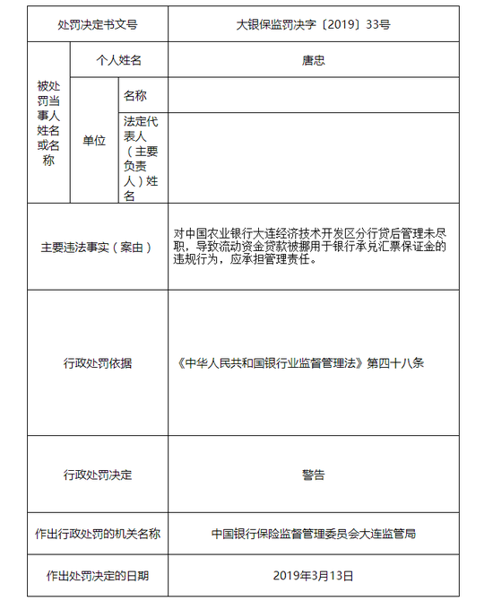 大连银保监局决定对中国农业银行股份有限公司大连经济技术开发区分行罚款人民币50万元,相关责任人唐忠被予以警告。